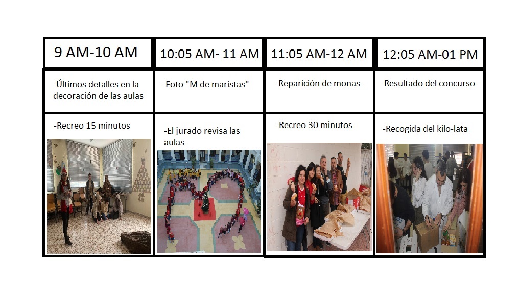 Comenzando el final del tercer trimestre todas las clases se preparan para el concurso navideño una de las partes más importantes es la decoración los alumnos suelen traerse sus propios materiales para con ellos hacer sus objetos decorativos por ejemplo: